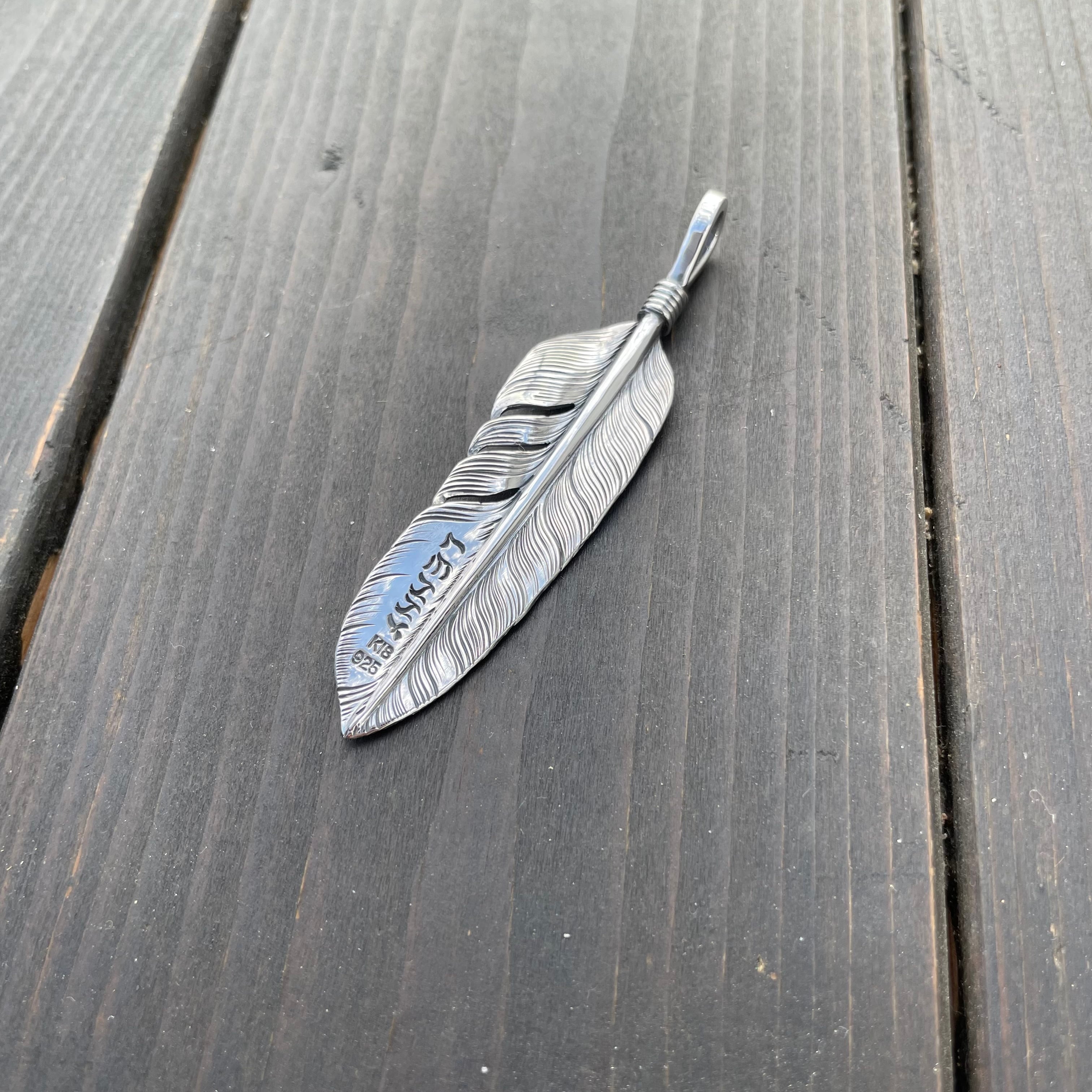 銀板を糸鋸で切り抜き、タガネを使い表面、裏面ともに羽根のラインを一本ずつ打ち込んで制作します。