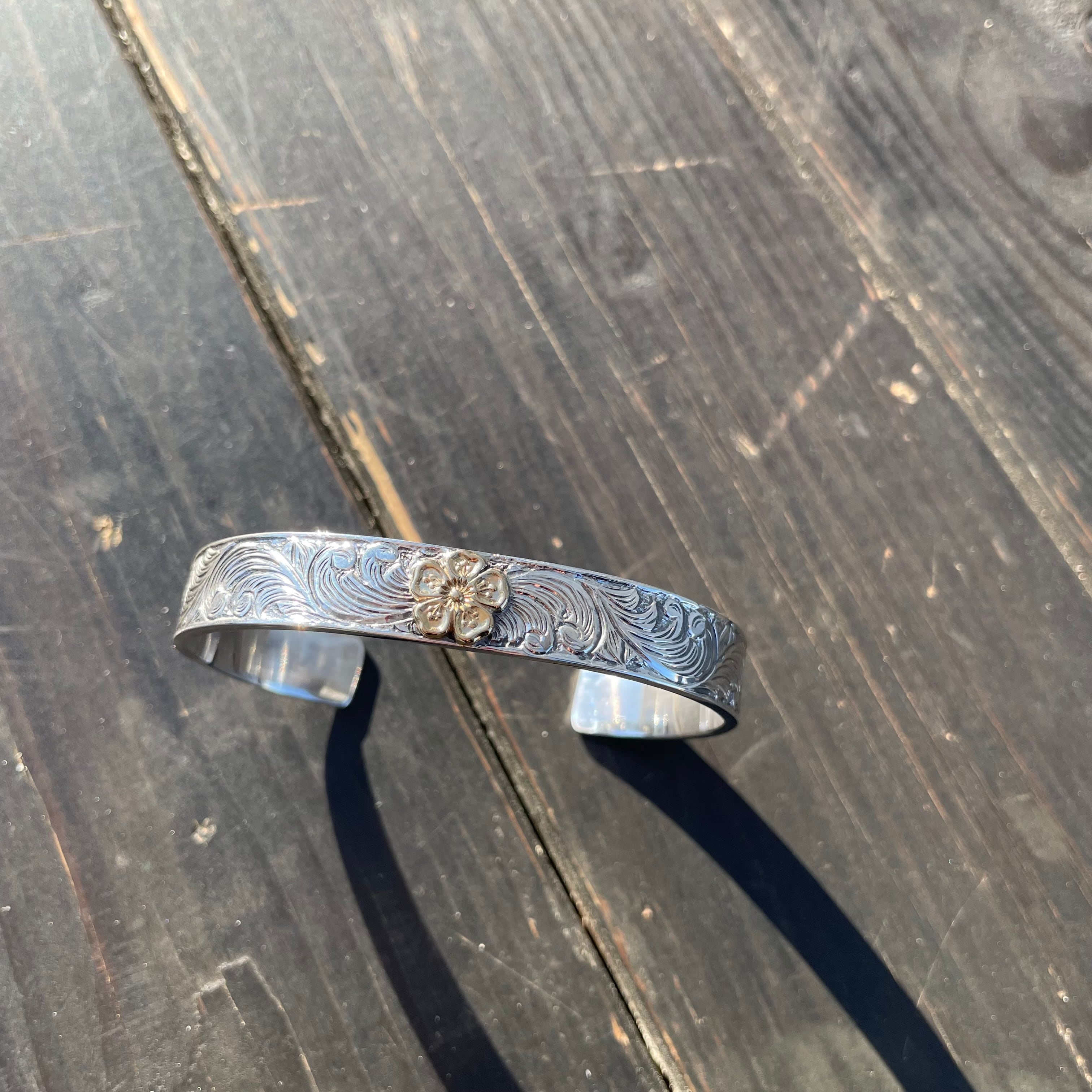 全体にスクロールの彫り加工を施した10mm幅のSv925製バングルをベースにK18のローズをセットしたバングルです。