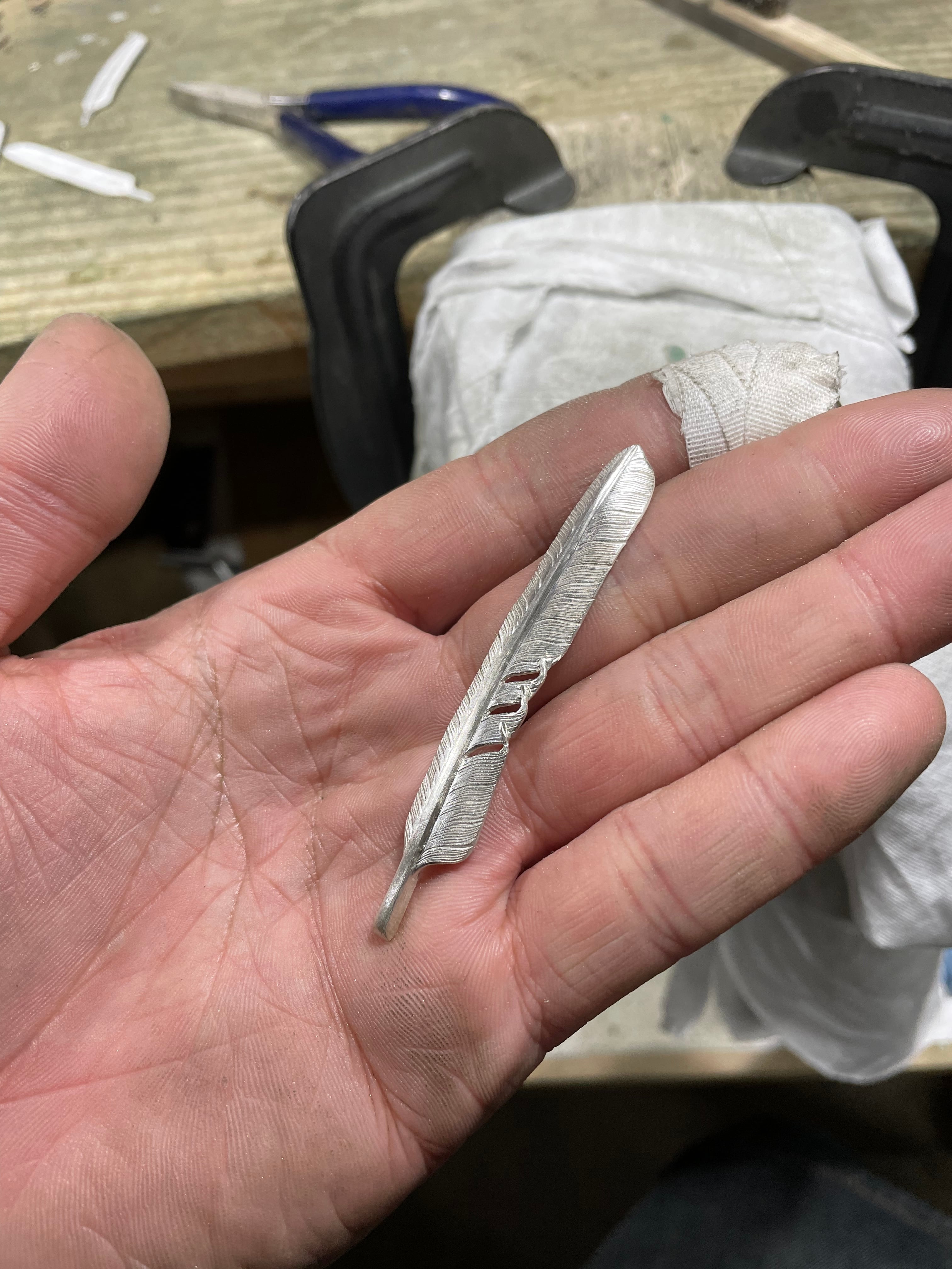 Sv925製フェザーリング,こちらはレギュラータイプよりリング幅が細身のナロータイプです。銀板を糸鋸で切り抜き、タガネを使い表面、裏面ともに羽根のラインを一本ずつ打ち込んで制作します。